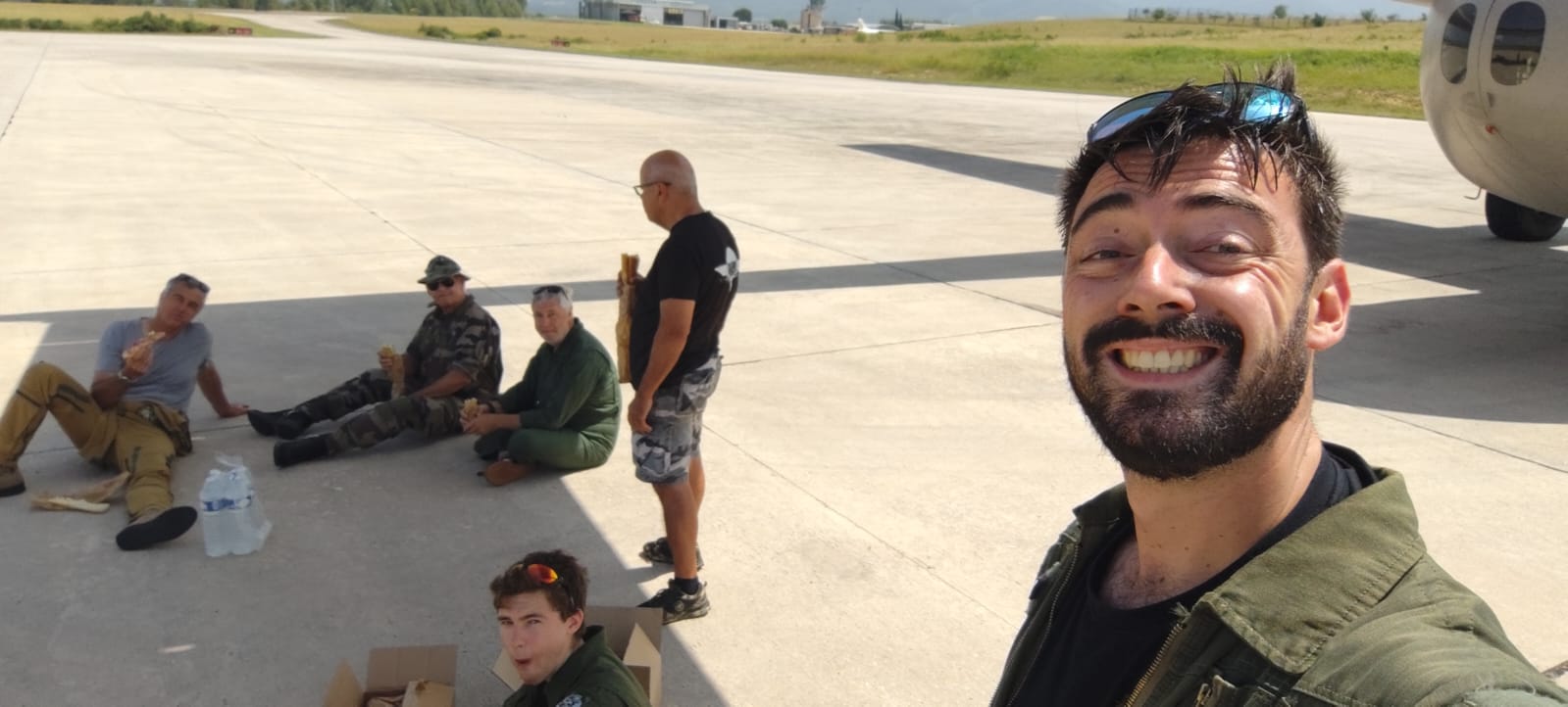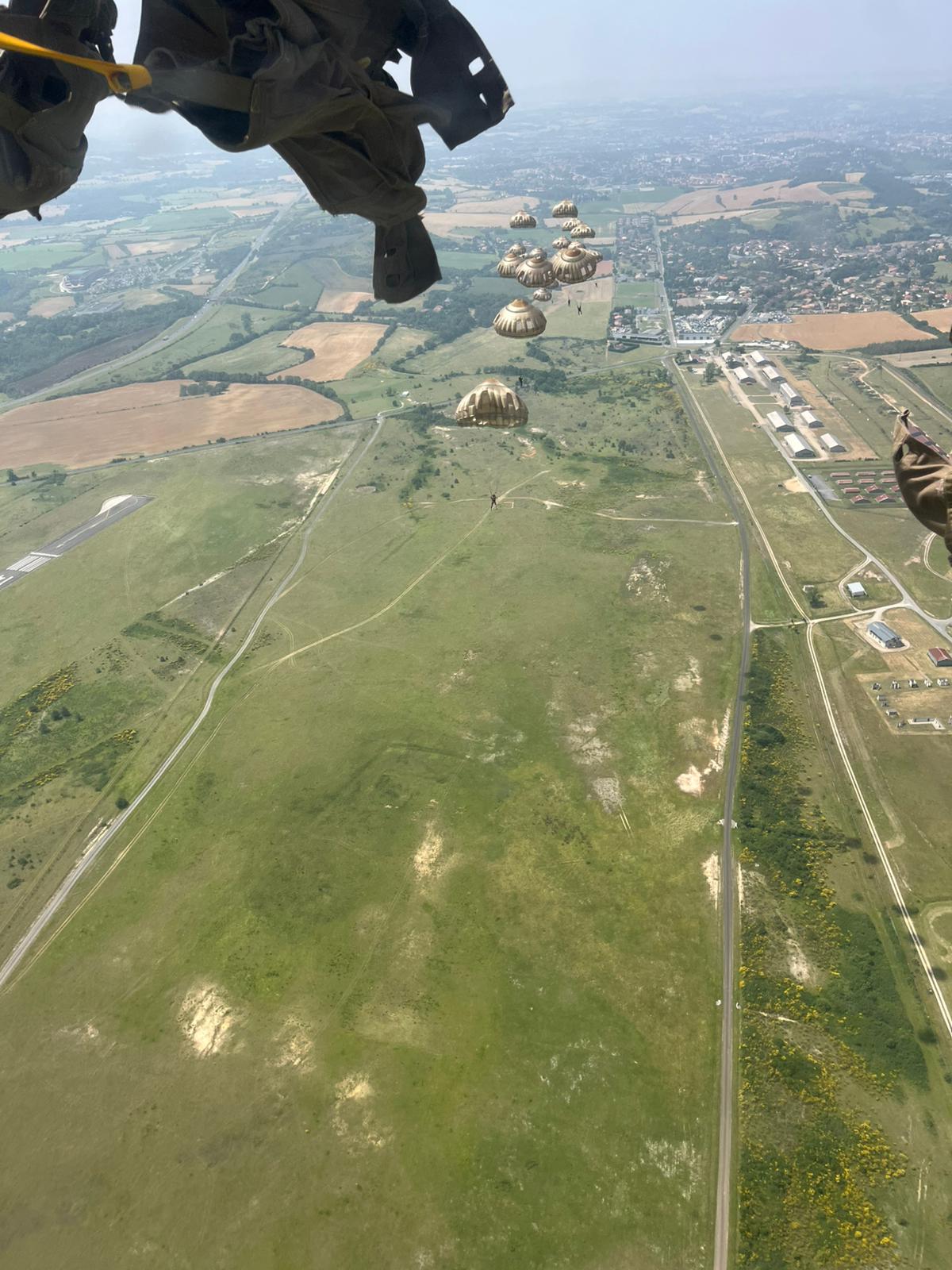 L’avion se pose à 11h, et après avoir intégralement vidé le cargo pour mettre la soute en configuration parachutisme, l’équipage se ravitaille en vue de l’activité dense de l’après-midi. Malgré une chaleur écrasante sous le soleil du sud-ouest, les paras et l’équipage sont prêts et nous décollons en début d’après-midi pour une série de largage OA sur la DZ de Castres, suivi par des OR.