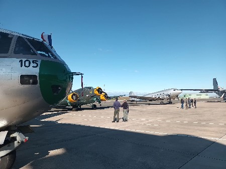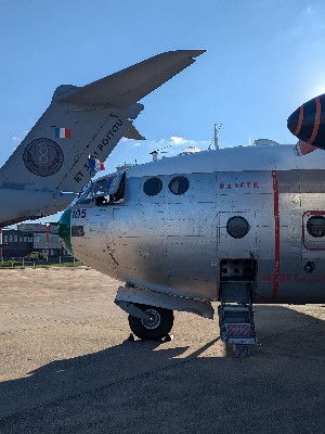 Nous rejoignons l'ancienne base aérienne et retrouvons notre Grise qui a passé la nuit dans un hangar en compagnie du Nord n°171, mais également d'un Vautour II N, d'un Fouga Magister et d'un Super Mystère B2. Les bénévoles de Canopée, les usagers et les curieux sont présents pour assister au départ de notre monument historique, désirant profiter jusqu’au dernier moment de la symphonie de nos deux Bristol Hercules 759.