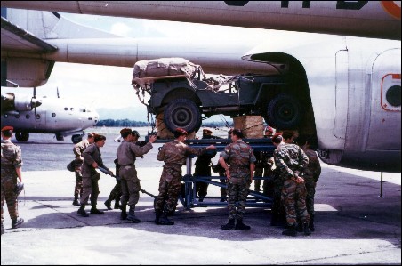 Pour l’arrimage des charges dans le Noratlas, je me souviens des plateformes, avec les bottes de pailles, et les torsades métalliques qui servaient à arrimer les charges, jeep notamment, mais aussi antennes chirurgicales, canons 105 italiens, etc… Pour les jeeps, à l’issue de l’arrimage nous sortions le mètre à ruban pour voir la hauteur de conditionnement qui devait être précise car l’empennage arrière du Nord ne souffrait d’aucune erreur. C’était bien souvent au centimètre prés, et en cas de doute, avec un madrier nous frappions sur le parachute pour le baisser de quelques centimètres.